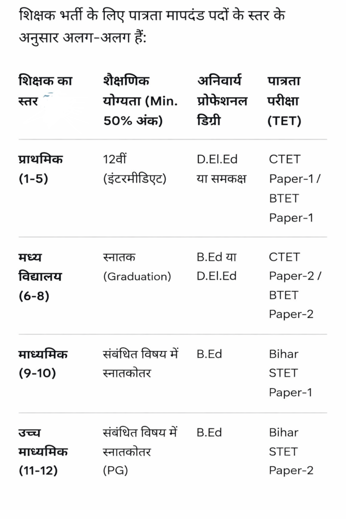 नोट: प्राथमिक विद्यालय (1-5) के लिए अब B.Ed धारक पात्र नहीं हैं, केवल D.El.Ed अनिवार्य है।